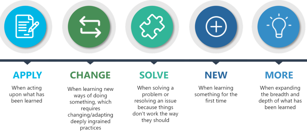 Far more common and impactful are the Apply, Change, and Solve components of learning need. These typically are the ones that crop up in daily work:
